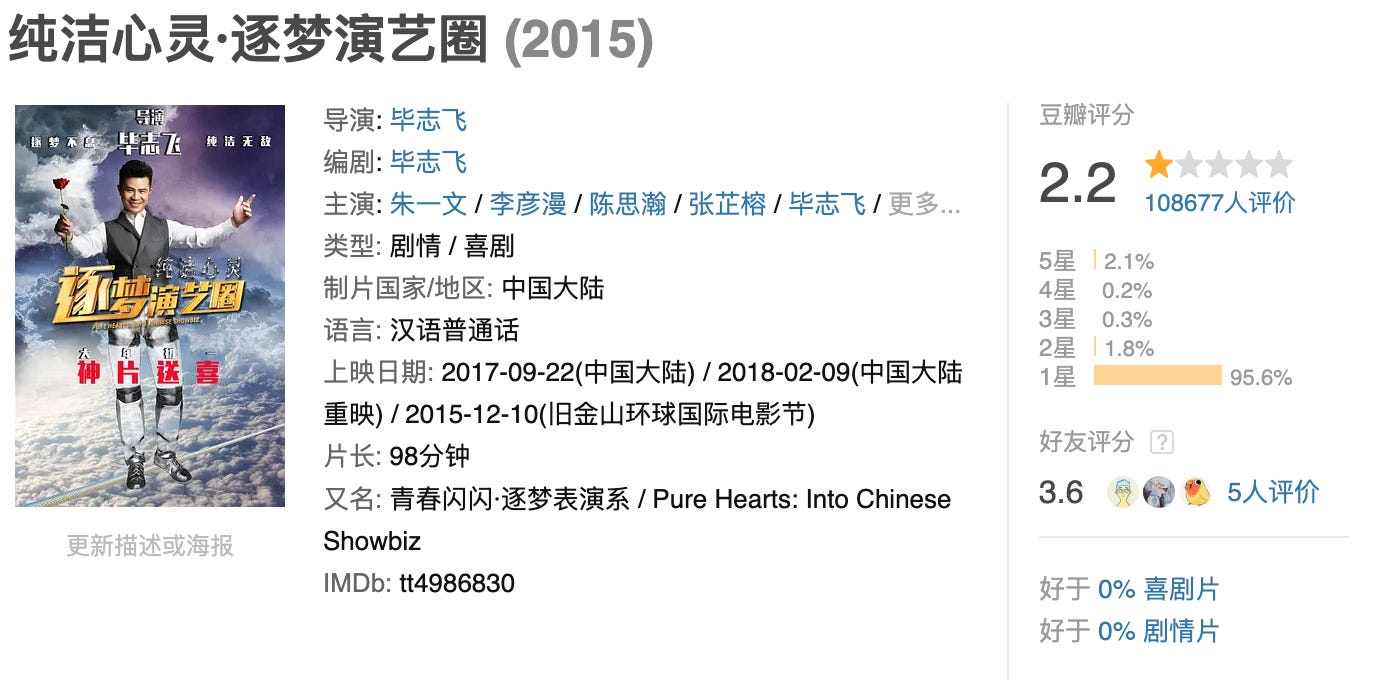 虽说样本够多的话还是有统计学意义,可文化品交给大众点评,涉及主观审美,通常毫无道理可言。《逐梦演艺圈》十万观众里,依然有两千多五星好评, 不管认真还是戏谑,论迹不论心,评分已成事实。