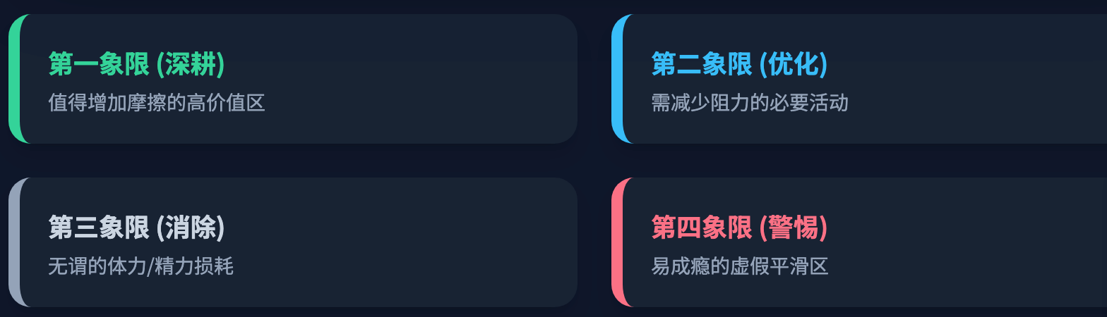 有鉴于此,我设计了一个四象限的思考框架,用来厘清「摩擦力」的留存价值: