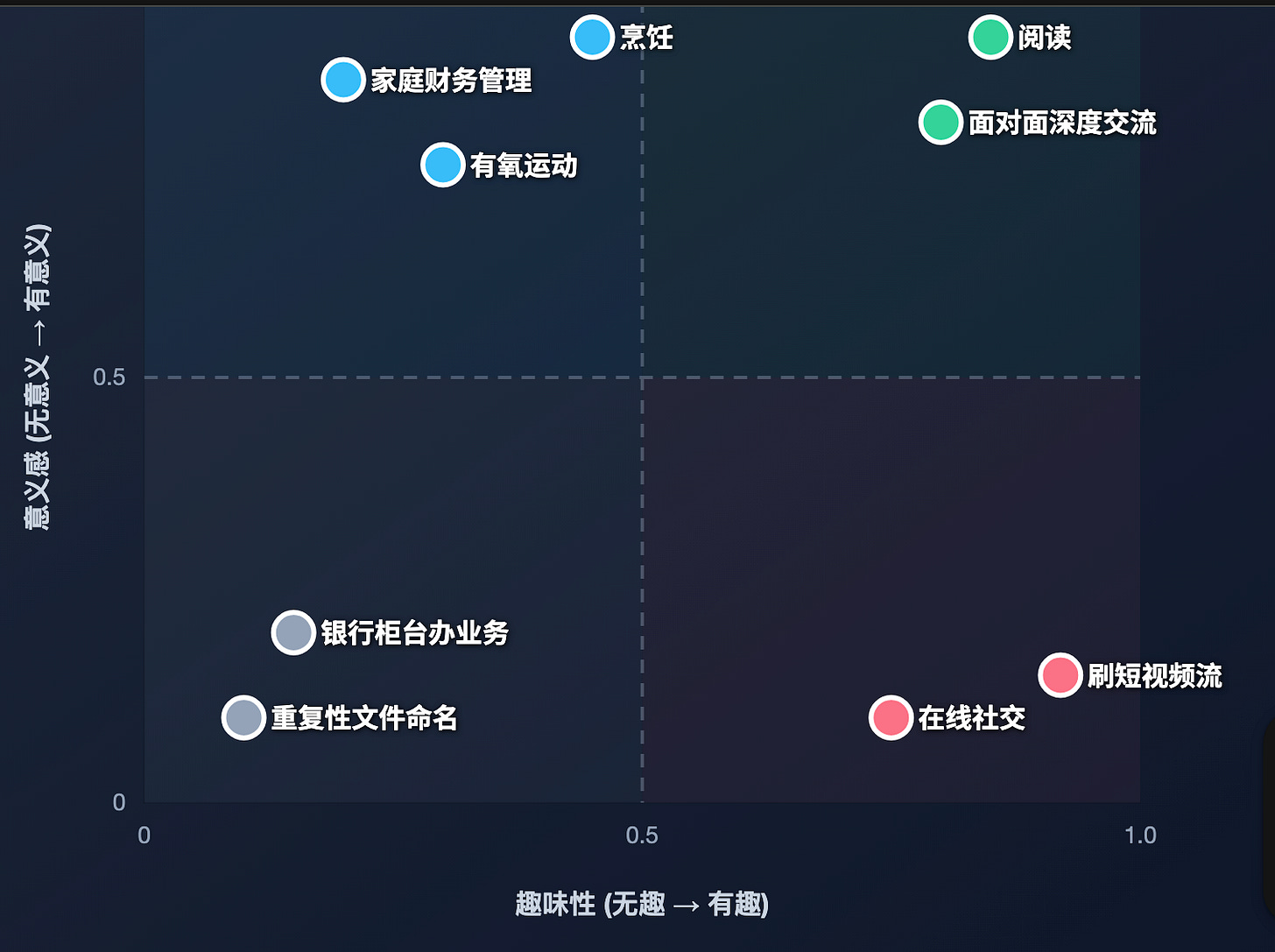 没那么有趣,但意义重要的蓝色区,积极借助工具克服摩擦(一双好的跑鞋,耐用的厨房电器,用 AI 分析上市公司的财报等等),同时坚持自主性,不能全盘外包(靠 AI 投资、或者全点外卖,我无法接受);