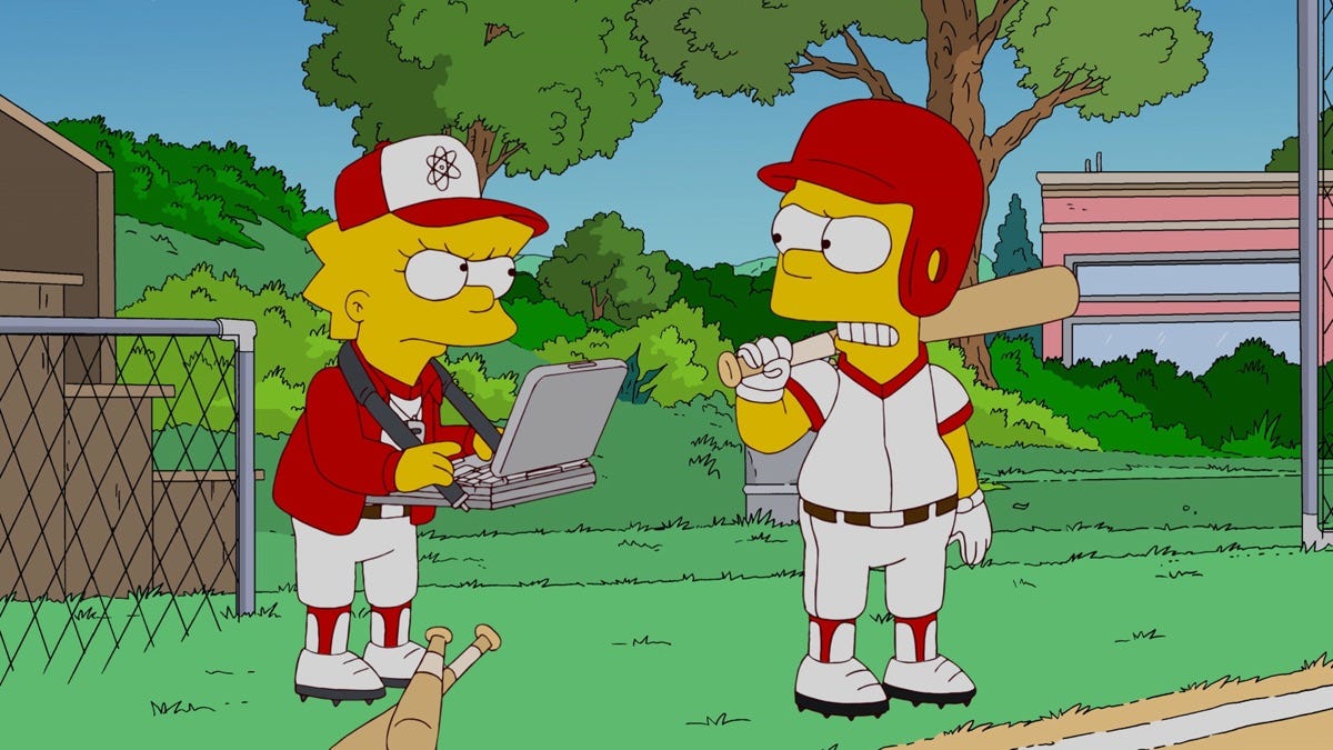 想起《辛普森一家》S22E03 里,学霸妹妹 Lisa 机缘巧合接管了哥哥 Bart 效力的棒球队。不懂棒球的她,利用赛伯计量学(Sabermetrics)之魔法一通排兵布阵,最终引发 Bart 不满——在球员眼里,这样还有什么乐趣可言?自己和一枚棋子还有什么区别!