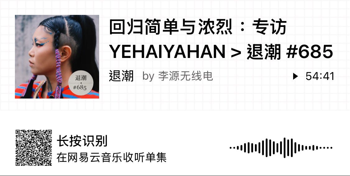 回归简单与浓烈:专访 YEHAIYAHAN Yuan LiOct 26, 20252ShareYEHAIYAHAN, 也叫 ChaCha,是我最喜欢的中国音乐人之一。她以不同的音乐分身活跃在独立音乐的世界,声音表现张力十足,狂放不羁,也可以妩媚动人,始终保持着特立独行的音乐审美。她是真的酷。今年初秋 ChaCha 来到台北演出,一起走街串巷之余,我才第一次有机会真正了解舞台之外的她。这期播客缘起是一顿午饭的闲聊,没想到越说越深,害我忍不住打断 ChaCha 说,等一下,我们留在节目里讲吧……收听方式:网易云音乐小宇宙-李源2025.10.26ShareSubscribePreviousNext